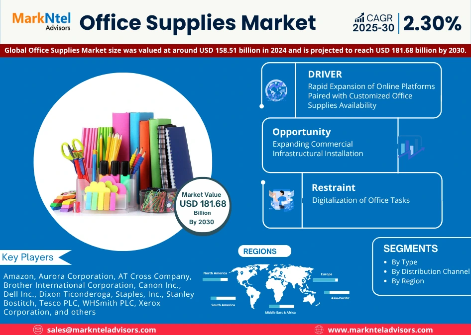 MarkNtel Advisors, a leading market research and consulting firm, has announced the release of its latest study titled Office Supplies Market Research Report: Forecast (2025–2030). This report provides a detailed assessment of the Office Supplies Market, covering its evolving dynamics, emerging trends, key growth drivers, major challenges, and competitive landscape.