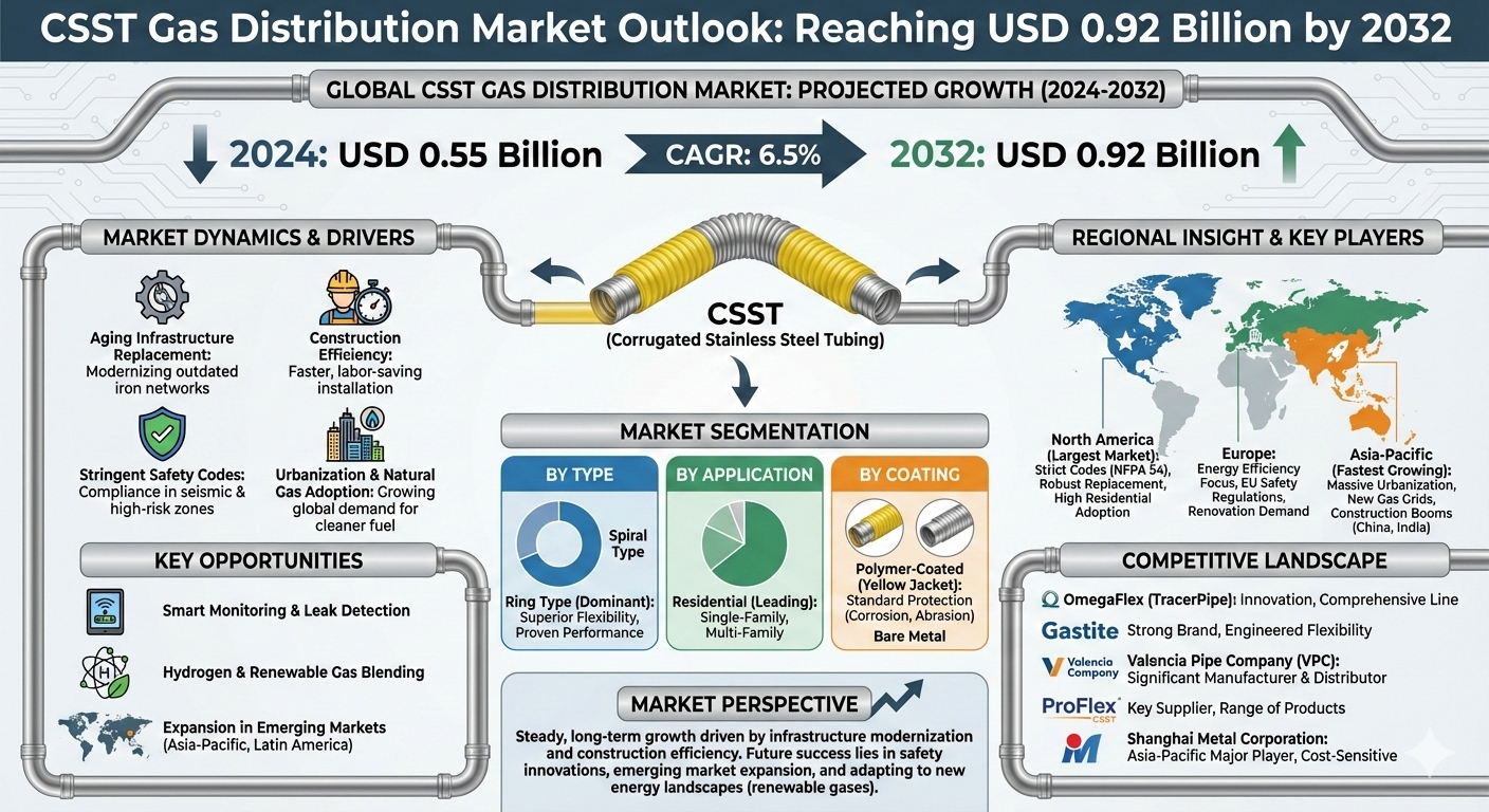 Corrugated Stainless Steel Tubing (CSST) for Gas Distribution market comprises flexible, thin-walled stainless steel piping systems designed for safe and efficient fuel gas delivery in residential, commercial, and industrial settings. CSST offers significant advantages over traditional rigid black iron pipe, including easier installation, reduced labor costs, and superior flexibility for routing around obstacles. From a valuation of USD 0.55 billion in 2024, the market is projected to grow at a CAGR of 6.5% to USD 0.92 billion by 2032. This growth is propelled by global urbanization, the ongoing transition to natural gas, and the construction industry's demand for efficient, cost-effective building materials.