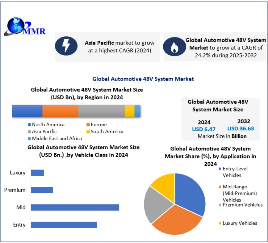 The global Automotive 48V System Market was valued at USD 6.47 billion in 2024 and is undergoing rapid transformation as automakers accelerate electrification strategies. With growing pressure to reduce emissions while maintaining vehicle performance, the market is projected to expand at a robust CAGR of 24.2% from 2025 to 2032, reaching approximately USD 36.63 billion by 2032.