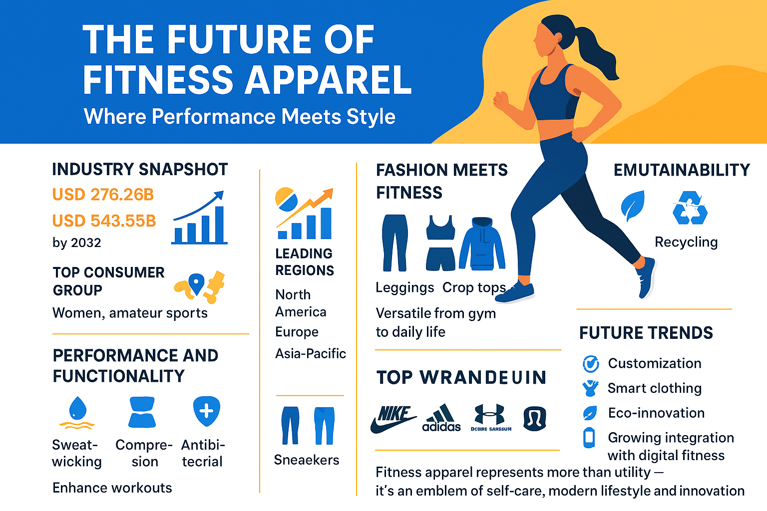 Increasing health awareness, athleisure trends, technological textile innovations, and higher disposable income are major growth drivers.