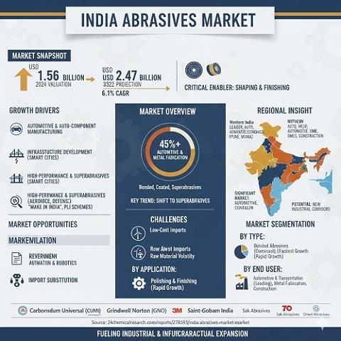 India abrasives market is on a robust growth trajectory, mirroring the nation's accelerating industrial and infrastructural expansion. Valued at USD 1.56 billion in 2024, the market is projected to reach USD 2.47 billion by 2032, expanding at a CAGR of 6.1%. As a critical enabler across manufacturing value chains, abrasives—from grinding wheels to diamond tools—are essential for shaping, finishing, and refining materials. This growth is fundamentally driven by the government's strategic push under initiatives like 'Make in India' and the Production Linked Incentive (PLI) schemes, which are catalyzing sectors such as automotive, capital goods, and infrastructure, thereby fueling Download Report: https://www.24chemicalresearch.com/reports/278393/india-abrasives-market-market