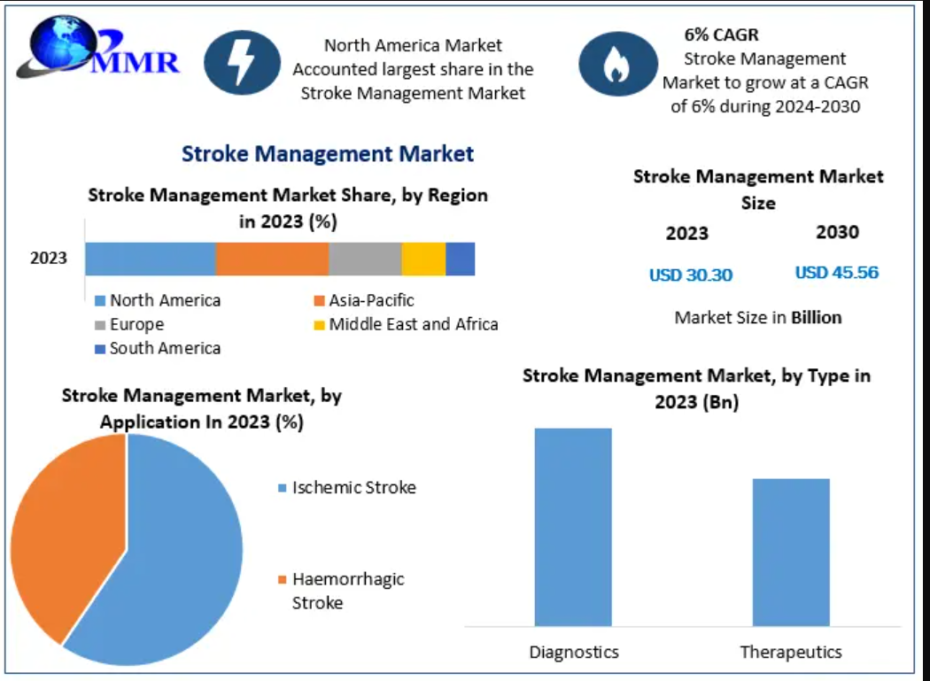 Stroke Management Market is expected to reach USD 45.56 Bn. at a CAGR of 6% during the forecast period 2030.