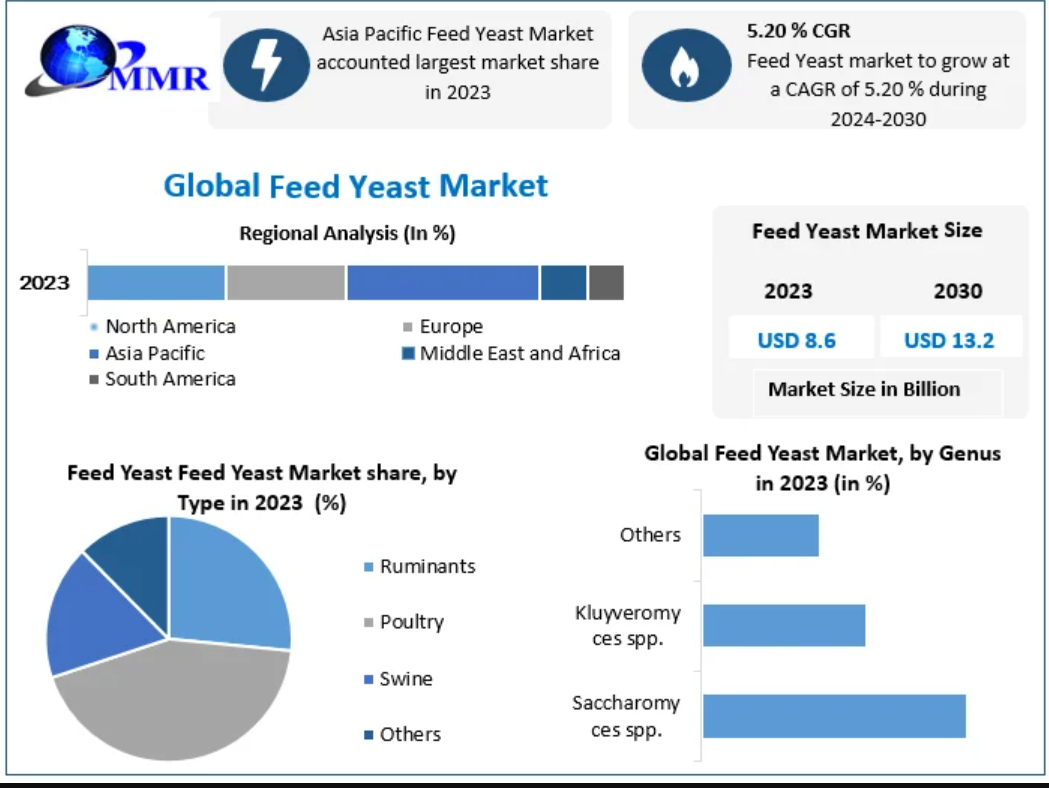 Feed Yeast Market is anticipated to reach USD 13.2 Billion by 2030 from USD 8.6 Billion in 2023 at a CAGR of 5.20 % during a forecast period.