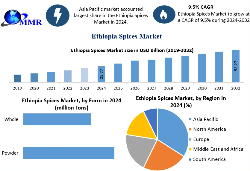 The Ethiopia Spices Market is emerging as a high-potential segment in the global food ingredients space, driven by strong domestic demand, rich agro-ecological conditions, and growing export opportunities. Valued at approximately 25.77 million tons in 2024, the market is forecast to expand at a CAGR of 9.5% from 2025 to 2032, reaching an estimated 53.27 million tons by 2032, reflecting robust long-term growth potential.
