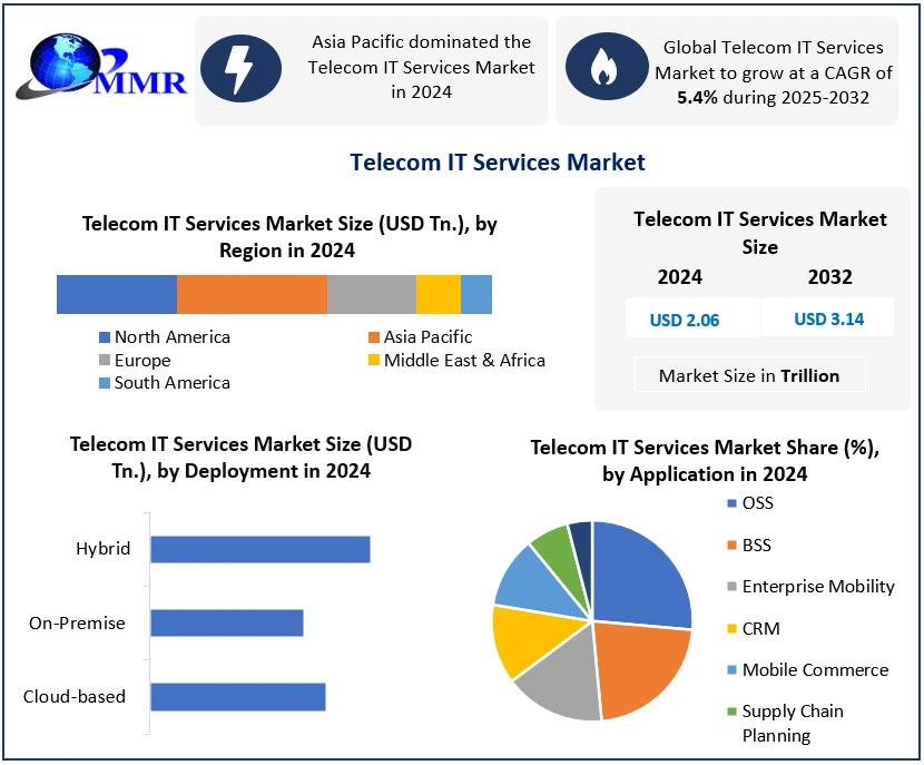 The Telecom IT Services Market was valued at USD 2.06 Tn in 2024, and the total revenue of the Telecom IT Services Market is expected to grow at a CAGR of 5.4% from 2025 to 2032, reaching nearly USD 3.14 Tn by 2032. Hybrid deployment and SME cloud migration fuel digital transformation momentum.