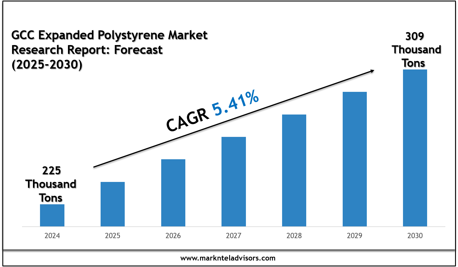 The GCC Expanded Polystyrene Market size was valued at around 225 Thousand Tons in 2024 and is projected to reach 309 Thousand Tons by 2030. Along with this, the market is estimated to grow at a CAGR of around 5.41% during the forecast period, i.e., 2025-30.