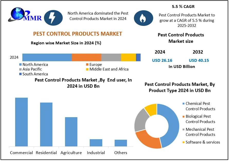 The Pest Control Products Market size was valued at USD 26.16 Billion in 2024, and the total revenue is expected to grow at CAGR of 5.5 % from 2025 to 2032, reaching nearly USD 40.15 Billion.