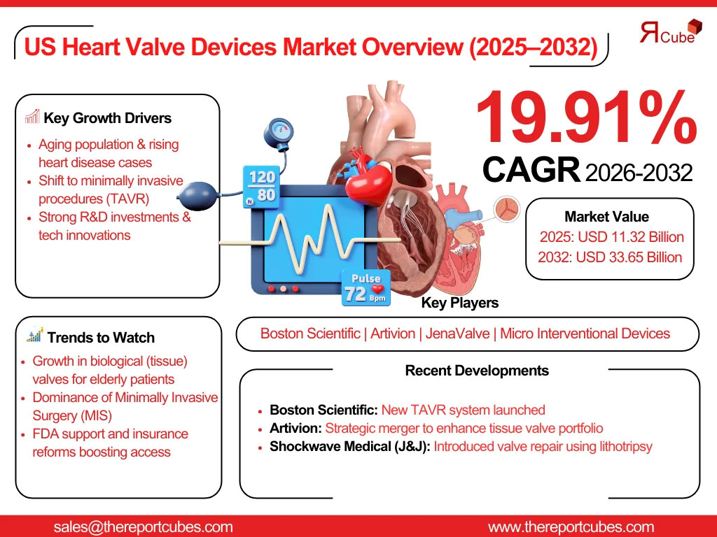 The US Heart Valve Devices Market reached a value of nearly USD 11.32 billion in 2025. The market is assessed to grow at a CAGR of around 19.91%, during the forecast period of 2026-2032 to attain a value of around USD 33.65 billion in 2032. The industry is compelled by an uptick in the aging population, increasing prevalence of valvular heart diseases, and growing patient preference for minimally invasive procedures. Heart valve devices are medical implants utilized to treat conditions including one or more of the heart's four valves. Also, the major types include biological (tissue) valves & mechanical valves, while treatment measures typically involve either open surgery or transcatheter aortic valve replacement (TAVR).