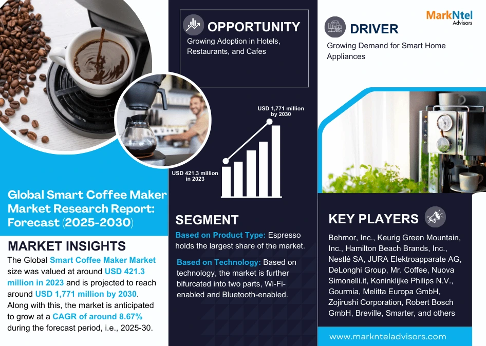 MarkNtel Advisors, a leading market research and consulting firm, has announced the release of its latest study titled Smart Coffee Maker Market Research Report: Forecast (2025–2030). This report provides a detailed assessment of the Smart Coffee Maker Market, covering its evolving dynamics, emerging trends, key growth drivers, major challenges, and competitive landscape.