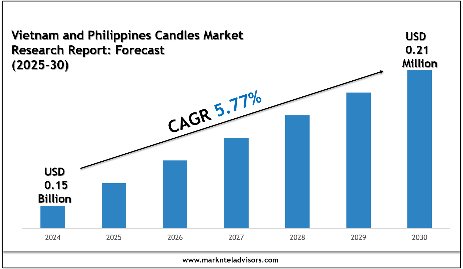 The Vietnam and Philippines Candles Market size is valued at USD 0.15 billion in 2025 and is projected to reach USD 0.21 billion by 2030. Along with this, the market is estimated to grow at a CAGR of around 5.77% during the forecast period, i.e., 2025-30. The growth of the market is driven primarily by the increasing inclination of people toward enhancing the aesthetics of their homes & other facilities, entwined with their improving economic conditions, changing living standards, and growing preference for measuring the quality of life, i.e., surging the demand for candles and driving the market.