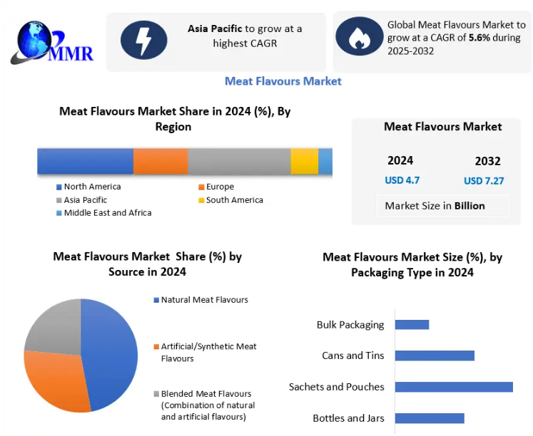 The Meat Flavours Market is poised for robust growth over the coming decade, driven by rising demand for processed and convenience foods, increasing global interest in plant‑based diets, and shifting consumer preferences toward natural, clean-label ingredients. With a projected market size of about USD 7.27 billion by 2032, there is significant opportunity for food manufacturers, flavour houses, and ingredient suppliers.