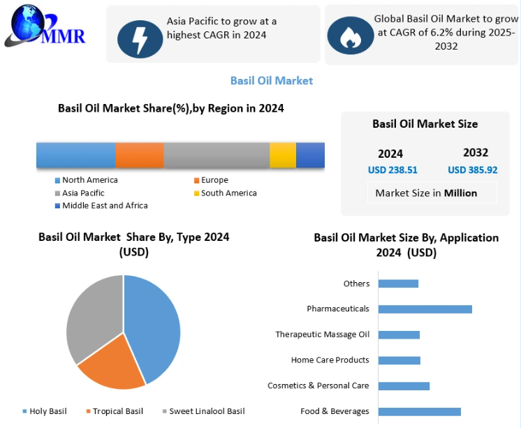 The global Basil Oil Market is witnessing steady expansion driven by rising consumer demand for natural, plant-based, and therapeutic products. Basil oil, extracted from the Ocimum basilicum plant, is widely used across aromatherapy, cosmetics, pharmaceuticals, and food and beverage applications. The market has been growing consistently due to increasing awareness of essential oils’ benefits, particularly their antimicrobial, anti-inflammatory, and stress-relief properties. As consumers shift preference toward holistic wellness and clean-label products, basil oil continues to gain prominence across multiple industries. Strong demand from both household consumers and industrial users is expected to support market growth in the coming years.