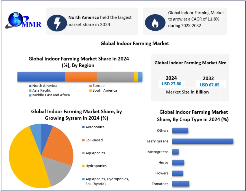 The Global Indoor Farming Market, valued at USD 27.80 billion in 2024, is projected to grow at a robust CAGR of 11.8% from 2025 to 2032, reaching approximately USD 67.85 billion by the end of the forecast period. The market is undergoing a rapid transformation as consumers shift toward healthier, pesticide-free diets and urbanization drives the demand for sustainable and space-efficient farming systems. Indoor farming—spanning greenhouses, vertical farms, and hybrid systems—ensures year-round production and resource-efficient cultivation, making it increasingly vital for global food security.