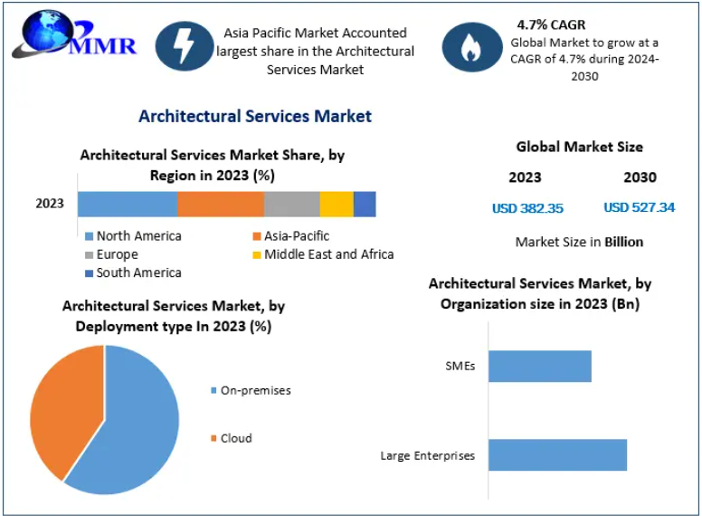 The global Architectural Services Market, valued at USD 382.35 billion in 2023, is projected to reach USD 527.34 billion by 2030, expanding at a CAGR of 4.7%. The industry is experiencing steady growth driven by rising investments in infrastructure development, rapid urbanization, and the integration of advanced technologies such as 3D printing, BIM, and cloud-based design platforms.