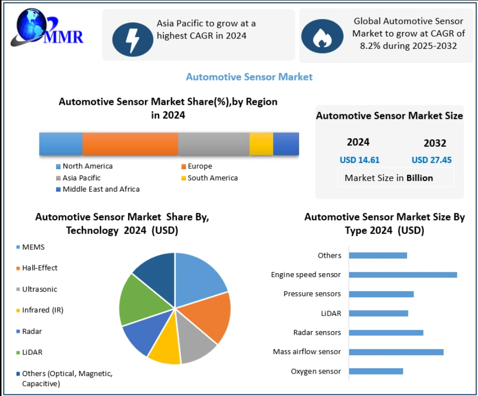 The Global Automotive Sensor Market was valued at USD 14.61 billion in 2024 and is projected to grow at a CAGR of 8.2%, reaching nearly USD 27.45 billion by 2032. Automotive sensors, essential components of modern vehicles, are revolutionizing mobility by enabling safer, more efficient, and technologically advanced transportation systems.