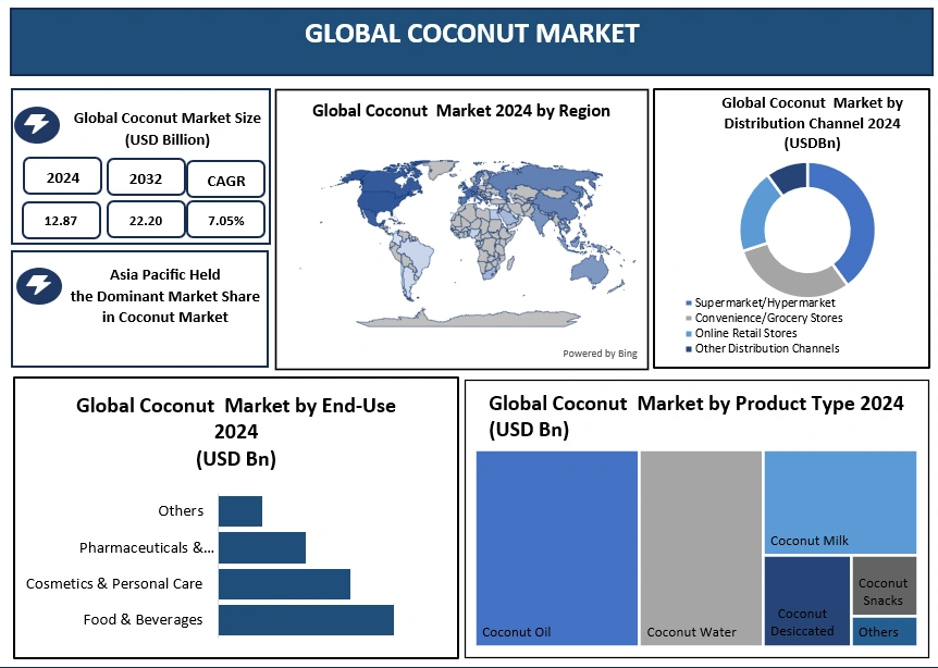 By end-use, the Food & Beverages sector dominates global demand, accounting for the majority of consumption. Coconut is widely used in baked goods, confectionery, beverages, ready-to-eat meals, and ethnic cuisines. The Personal Care & Cosmetics segment is also expanding rapidly due to coconut oil’s moisturizing and skin-friendly properties. Distribution channels include supermarkets and hypermarkets, grocery and convenience stores, online retail platforms, and specialty outlets.