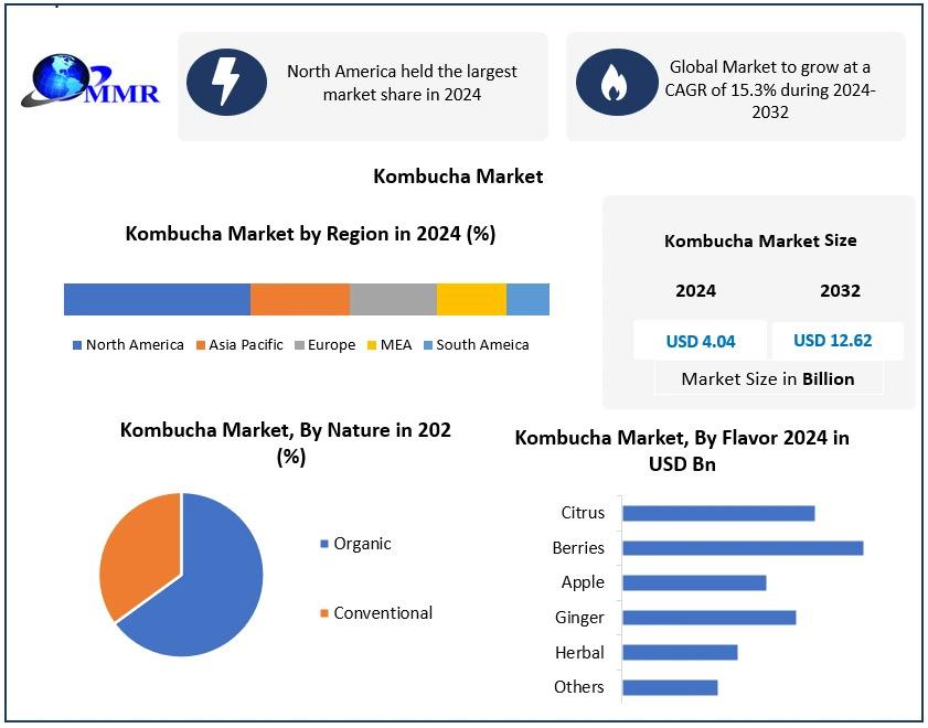 Kombucha Market was valued at USD 4.04 Bn in 2024, and total global Kombucha Market revenue is expected to grow at CAGR of 15.3% and reach nearly USD 12.62 Bn from 2025-2032, driven by growing consumer preference for gut-friendly and functional beverages.