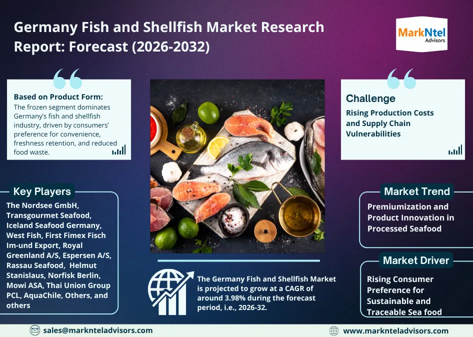 MarkNtel Advisors, a leading market research and consulting firm, has announced the release of its latest study titled Germany Fish and Shellfish Market Research Report: Forecast (2026–2032). This report provides a detailed assessment of the Germany Fish and Shellfish Market, covering its evolving dynamics, emerging trends, key growth drivers, major challenges, and competitive landscape.