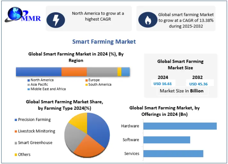 The Global Smart Farming Market, valued at USD 16.61 billion in 2024, is rapidly redefining the future of agriculture. Enabled by automation, big data analytics, AI-driven insights, and precision-based farm management tools, the sector is projected to grow at a CAGR of 13.38% from 2025 to 2032, ultimately reaching USD 45.36 billion. As the world grapples with climate instability, shrinking arable land, and an escalating demand for food, smart farming is emerging as the central pillar of agricultural modernization.